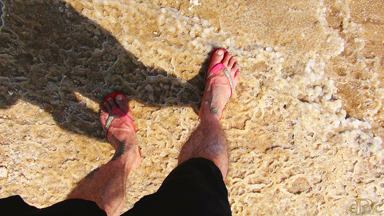 When you’re standing on the beach close to the water, your feet can’t sink in the sand, because there’s none, but a stiff and sharp ground made of salt. It’s advisable to keep your shoes.