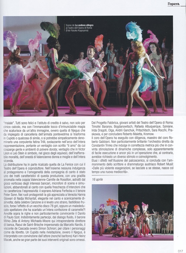 “Proposta al Gran Teatro La Fenice di Venezia per il Carnevale del 2018 la “nuova” produzione de La vedova allegra approda all’Opera di Roma in Settimana Santa 2019, confermando l’autorevole firma del regista Damiano Michieletto, più che dei librettisti Victor Léon e Leo Stein, pur sempre su musiche di Franz-Ferenc Léhar, con “variazioni”. Il manifesto è in italiano: “La vedova allegra”; in palcoscenico come voluto dal regista, però, si parla nell’originale tedesco Die lustige Witwe, con marcata dizione germanica e senza inflessioni viennesi da “Finis Austriae”. «Qualcosa che non mi piaceva in questa operetta – dichiara Michieletto – era l’ambiente dell’ambasciata» e di conseguenza il regista si è messo al lavoro per personalizzare l’azione, che cambia di luoghi e di tempo; non più i locali dell’ambasciata dell’immaginario piccolo stato del Pontevedro, non più chez Maxim’s, bensì l’interno di una piccola banca in fallimento negli anni Cinquanta, la Pontevedro Bank. Il…