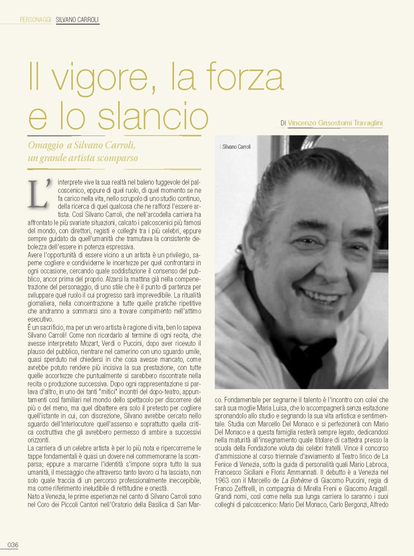L’interprete vive la sua realtà nel baleno fuggevole del palcoscenico, eppure di quel ruolo, di quel momento se ne fa carico nella vita, nello scrupolo di uno studio continuo, della ricerca di quel qualcosa che ne rafforzi l’essere artista. Così Silvano Carroli, che nell’arco della carriera ha affrontato le più svariate situazioni, calcato i palcoscenici più famosi del mondo, con direttori, registi e colleghi tra i più celebri, eppure sempre guidato da quell’umanità che tramutava la consistente debolezza dell’essere in potenza espressiva.
