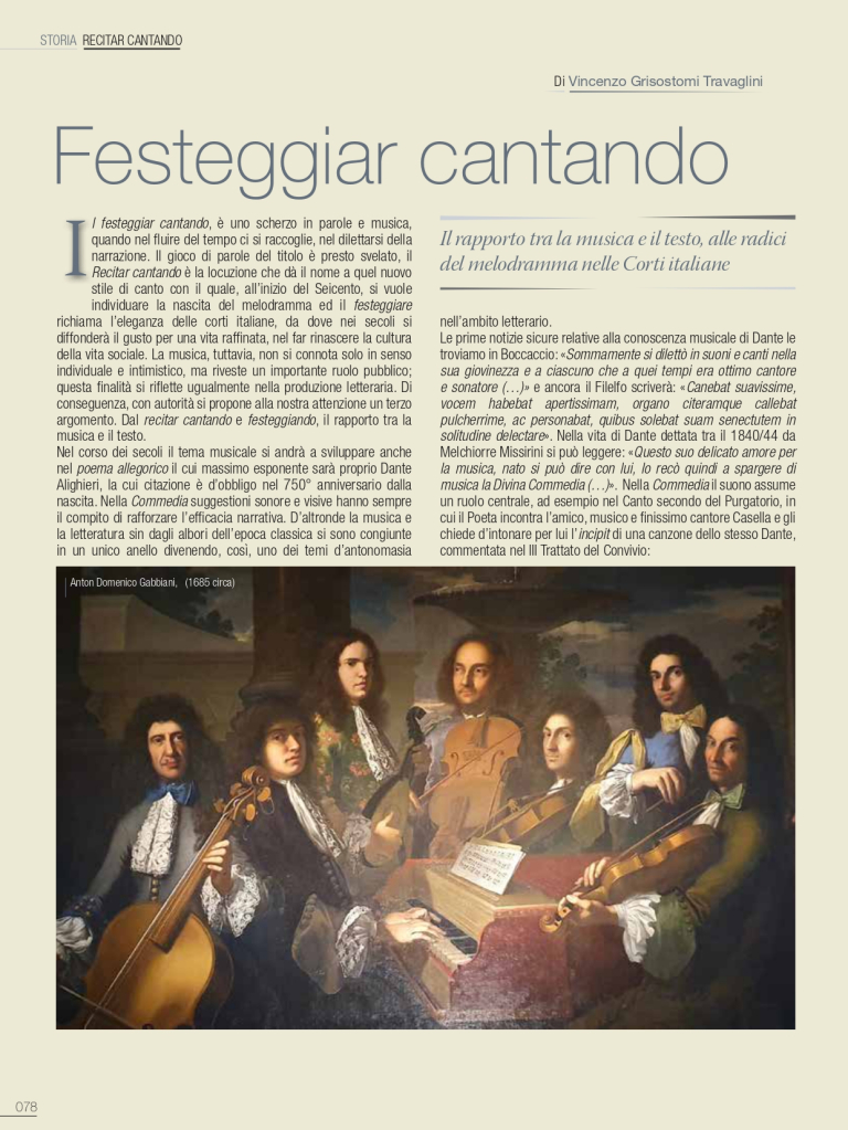 Il festeggiar cantando, è uno scherzo in parole e musica, quando nel fluire del tempo ci si raccoglie, nel dilettarsi della narrazione. Quando più si ha bisogno di distrazione e citando William Shakespeare, perché: «tutto il mondo è palcoscenico». Il gioco di parole del titolo è presto svelato, il Recitar cantando è la locuzione che dà il nome a quel nuovo stile di canto con il quale, all’inizio del Seicento, si vuole individuare la nascita del melodramma ed il festeggiare richiama l’eleganza delle corti italiane, da dove nei secoli si diffonderà il gusto per una vita raffinata, nel far rinascere la cultura della vita sociale. La musica, tuttavia, non si connota solo in senso individuale e intimistico, ma riveste un importante ruolo pubblico; questa finalità si riflette ugualmente nella produzione letteraria. Di conseguenza, con autorità si propone alla nostra attenzione un terzo argomento. Dal recitar cantando e festeggiando, il rapporto…