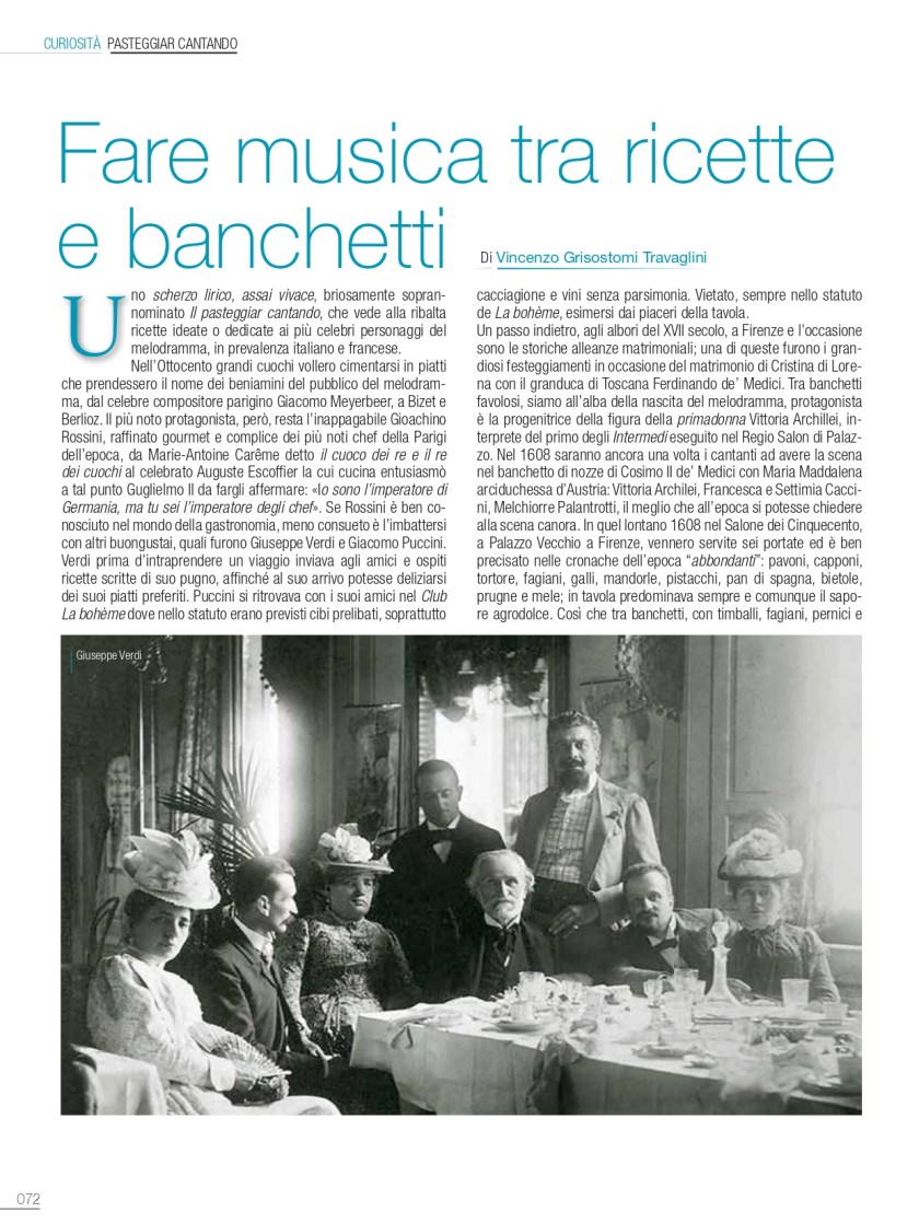 Nell’Ottocento grandi cuochi vollero cimentarsi in piatti che prendessero il nome dei beniamini del pubblico del melodramma, dal celebre compositore parigino Giacomo Meyerbeer, a Bizet e Berlioz. Il più noto protagonista, però, resta l’inappagabile Gioachino Rossini, raffinato gourmet e complice dei più noti chef della Parigi dell’epoca, da Marie-Antoine Carême detto il cuoco dei re e il re dei cuochi al celebrato Auguste Escoffier la cui cucina entusiasmò a tal punto Guglielmo II da fargli affermare: «Io sono l’imperatore di Germania, ma tu sei l’imperatore degli chef». Se Rossini è ben conosciuto nel mondo della gastronomia, meno consueto è l’imbattersi con altri buongustai, quali furono Giuseppe Verdi e Giacomo Puccini. Verdi prima d’intraprendere un viaggio inviava agli…